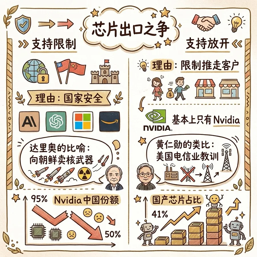 我倾向于认为黄仁勋在芯片出口上的判断方向是对的——限制在延缓,但延缓的窗口正在缩短,代价是把整个中国市场永久性地推向国产替代。不过他把达里奥的安全论证简化为「监管俘获」,这就过了。可以不同意,但不该矮化对方的论证。