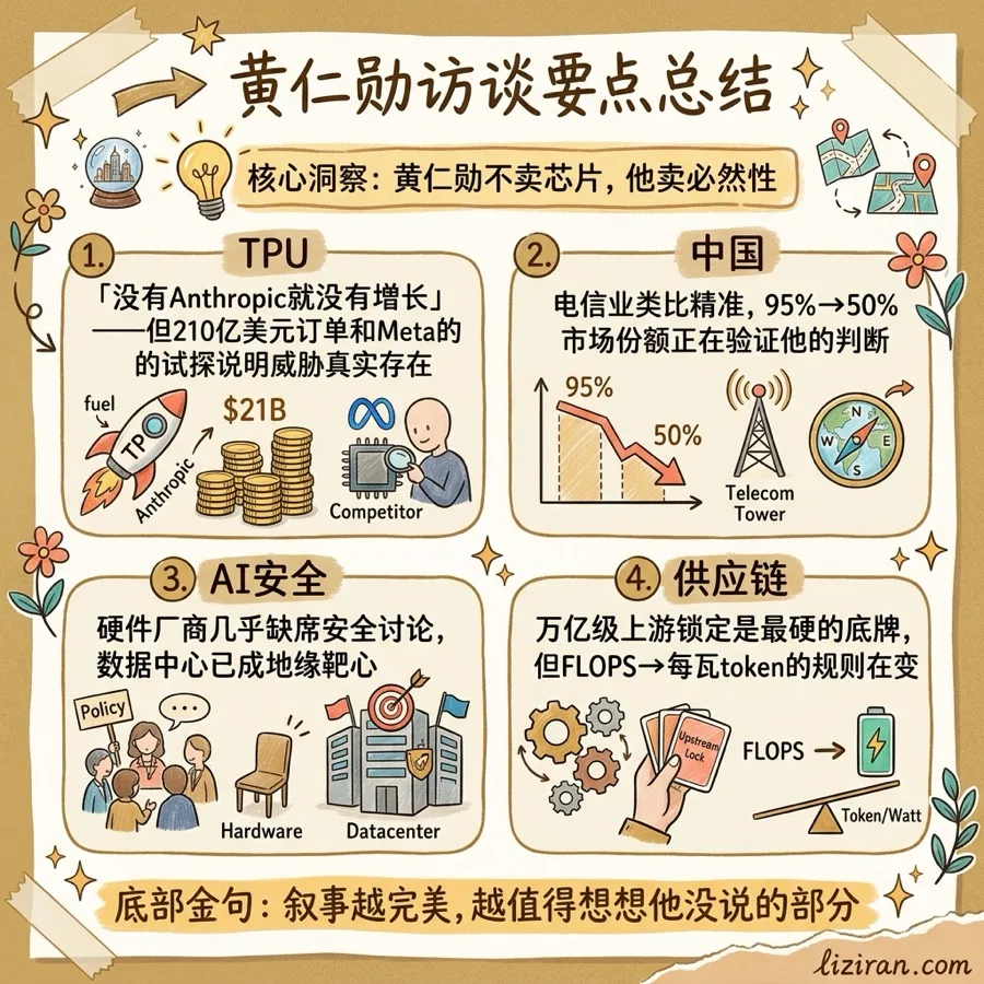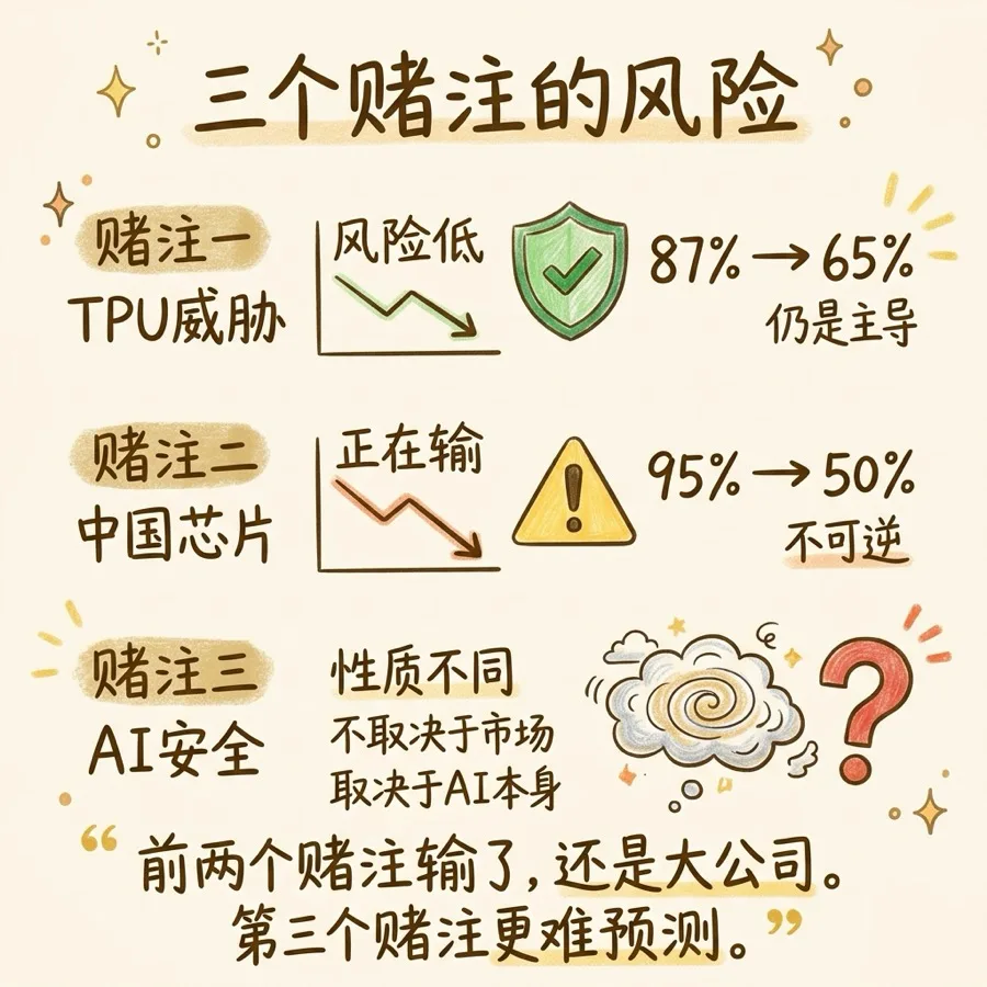 TPU威胁不了Nvidia,因为生态粘性比单品性能更持久。芯片禁令会损害Nvidia,因为它推动竞争对手建立独立生态。AI安全不应该限制Nvidia,因为问题的解法是更多AI,不是更少算力。